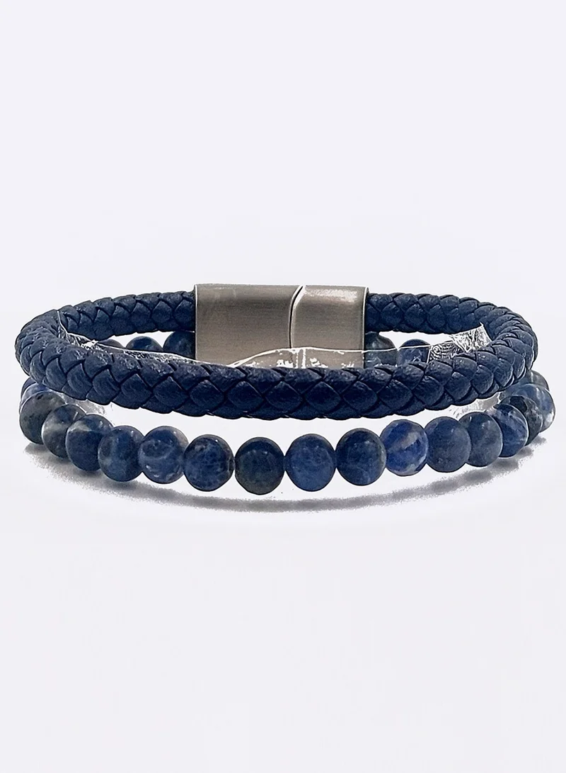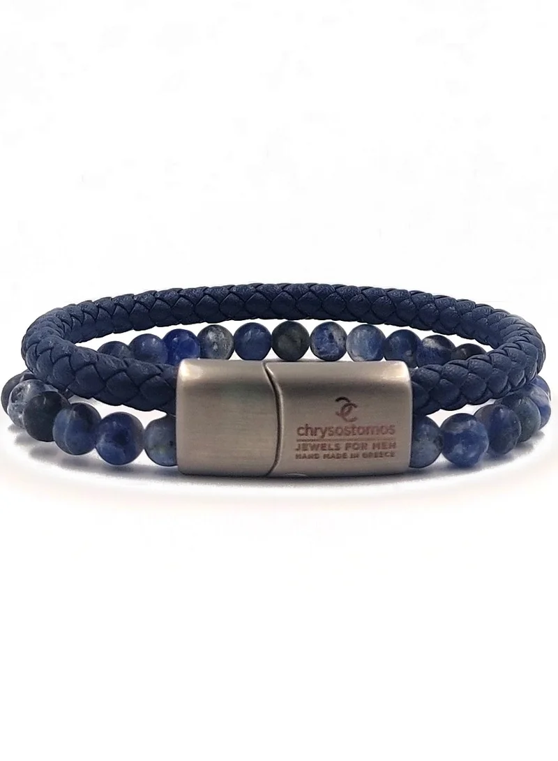Chrysostomos is a Greek luxury bracelet brand that elevates men's jewelry with bold, sophisticated designs rooted in artisanal excellence and modern elegance. Men’s handmade double bracelet with natural mineral stones of blue sodalite and blue leather braid. Crafted for the discerning individual, Chrysostomos jewelry reflects a heritage of excellence and an eye for detail that transcends trends.