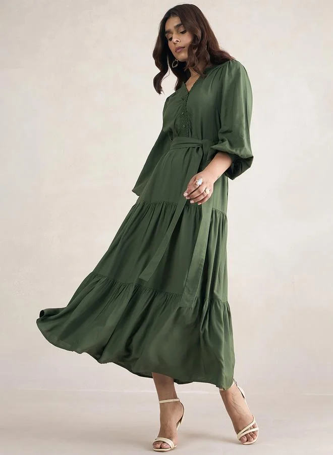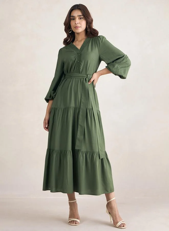 FEMELLA Smocked Detail Tiered Maxi Dress with Tie Belt by Styli