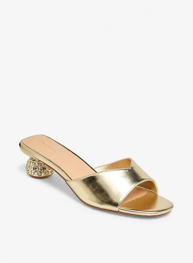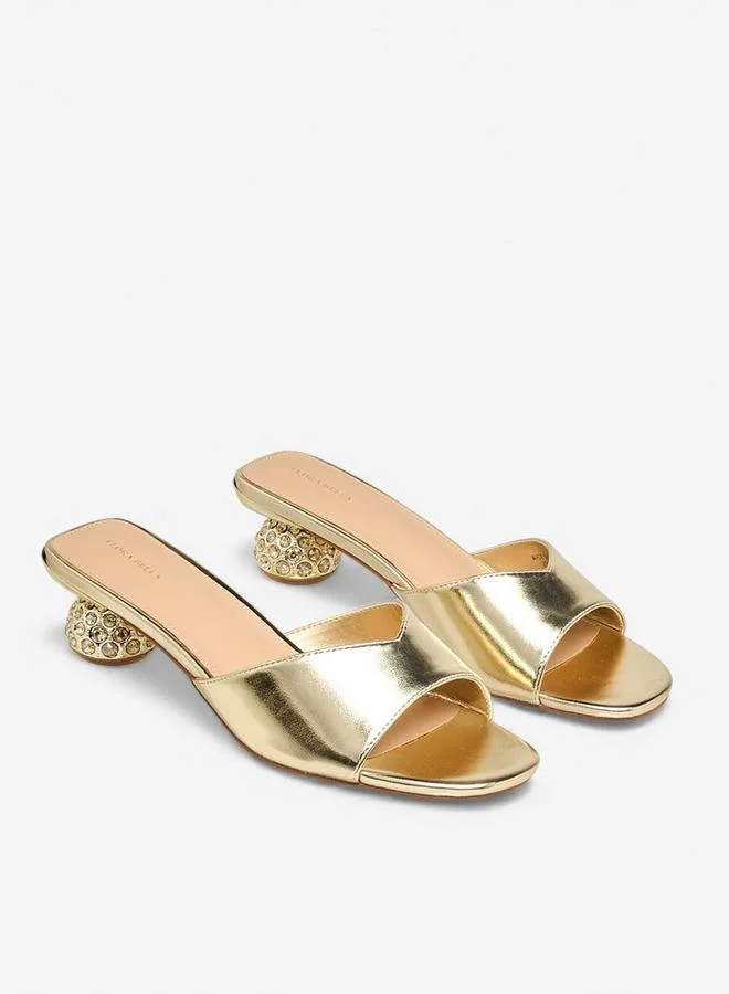 Step out in refined style with these elegant metallic slip-on sandals, ideal for elevating any outfit. These sandals feature a chic open-toe design and a decorative heel adorned with sparkling accents. The comfortable slip-on construction ensures ease of wear, making them a versatile choice for various occasions. Pair these sophisticated sandals with a formal dress or smart trousers for a polished, contemporary look.