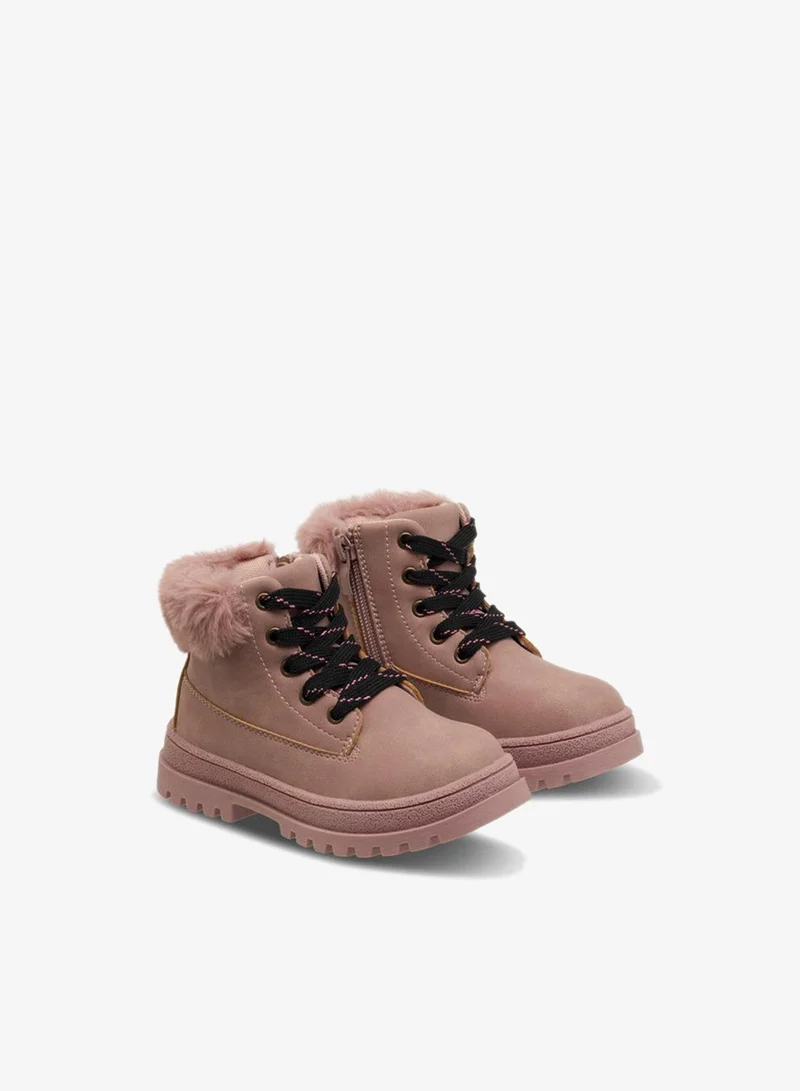 These charming girls' boots feature a soft faux fur trim, providing both warmth and a stylish accent for cooler weather. The practical side zip closure ensures easy on and off, while the secure lace-up front offers an adjustable fit. Designed for comfort and durability, these boots are perfect for everyday wear, keeping little feet cosy and supported during autumn and winter adventures. Pair them with jeans or a dress for a complete and fashionable look.