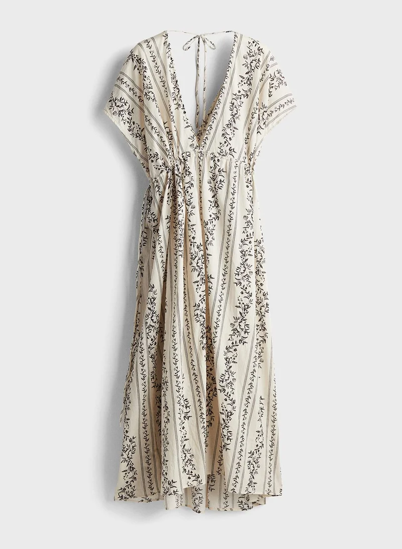 This midi dress features a vertical stripe and floral print, a deep v-neckline, and short sleeves. The light material gives it a breezy and effortless feel.