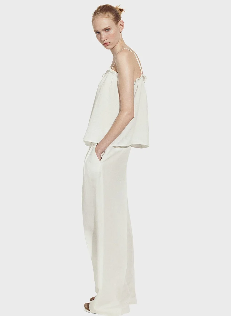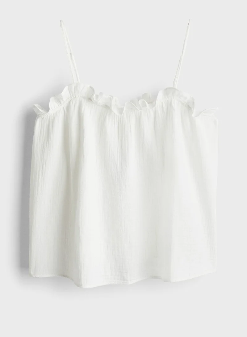 Loose-fit top in an airy weave with narrow, adjustable shoulder straps and a frill trim around the top