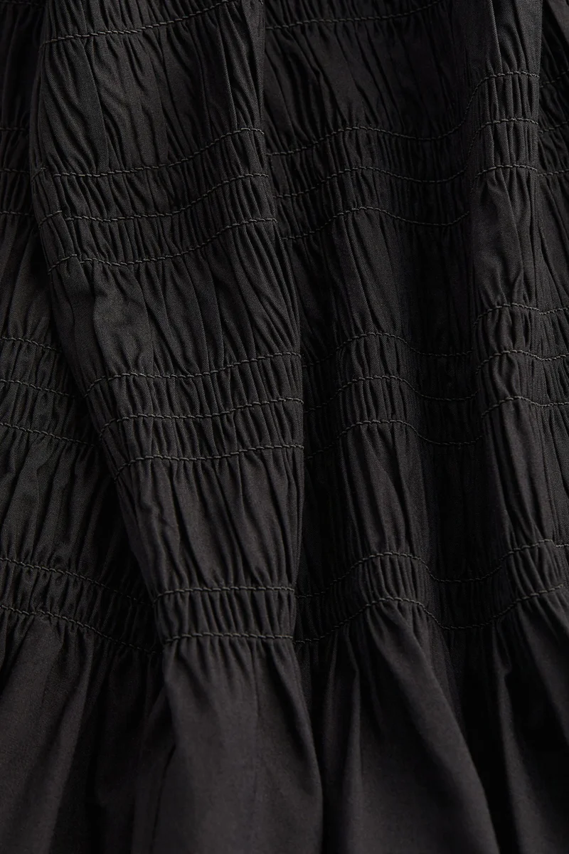 Short, off-the-shoulder dress in woven fabric featuring a fitted bodice and short sleeves, both with smocking and a small frill trim around the top edge. Gathers at the waist and a flared skirt. Unlined.