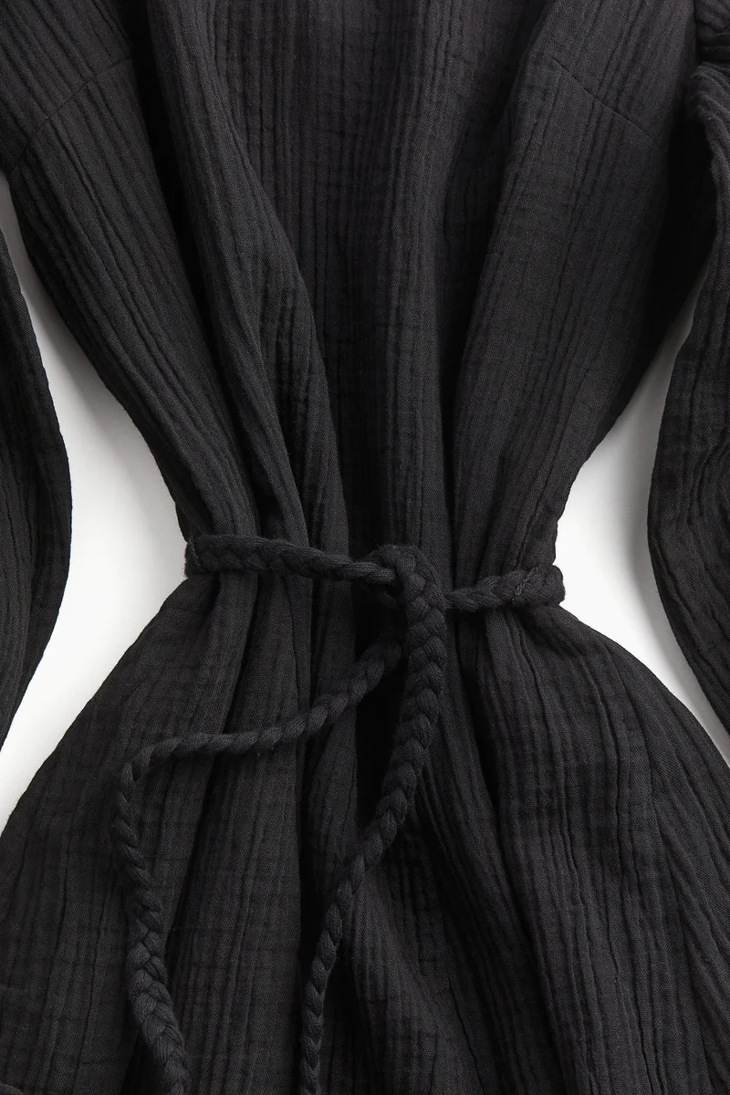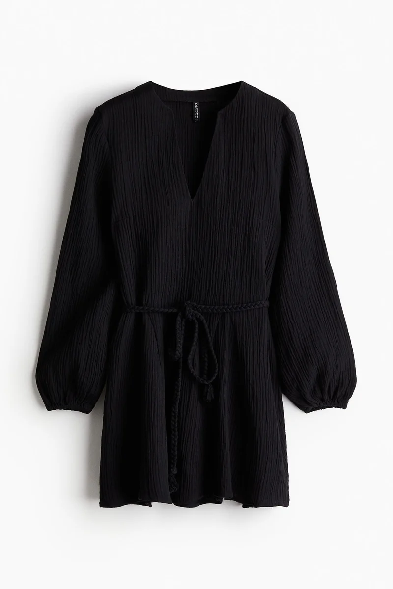Short dress in a cotton weave with a round neckline, V-shaped opening at the front and long balloon sleeves with narrow elastication at the cuffs. Detachable, braided tie belt at the waist with knotted ends, a fitted bodice and a flared skirt with godet pleats for added width. Short cotton underdress with narrow shoulder straps.