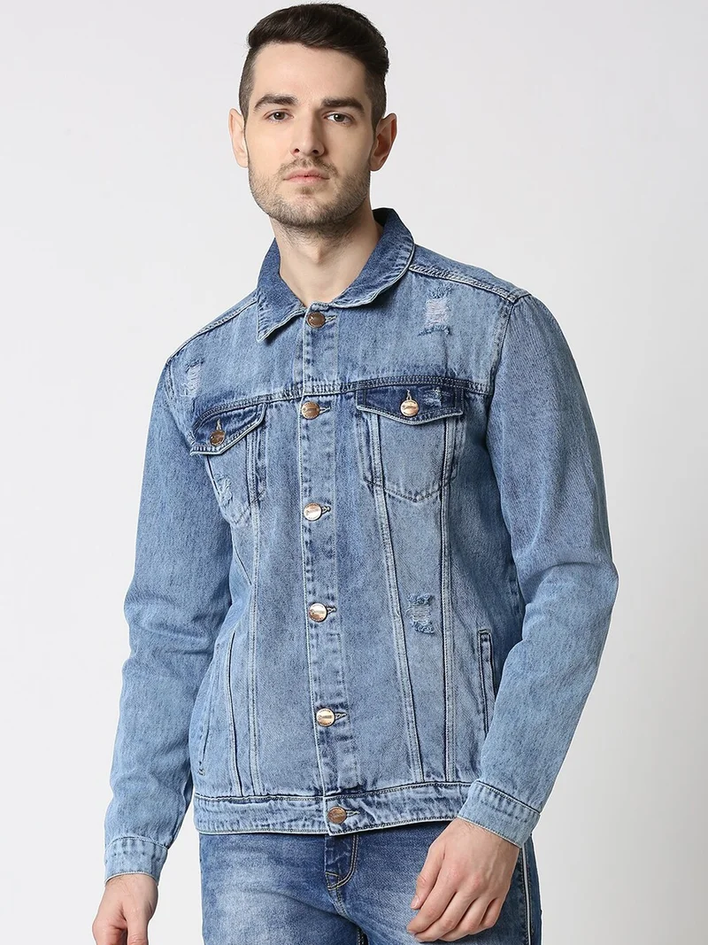 Men Blue Solid Denim Jacket