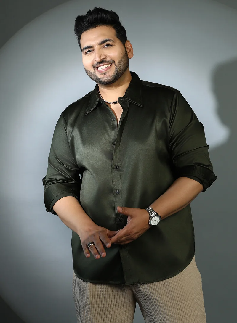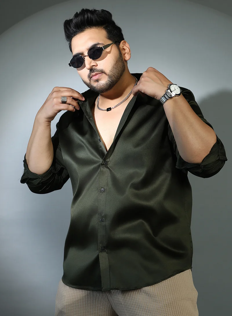 Instafab Plus Men's Sacramento Green Solid Satin Shirt For Casual Wear | Cuban Collar | Long Cuffed Sleeves | Button Closure | Plus Size Shirt Crafted With Comfort Fit For Everyday Wear
