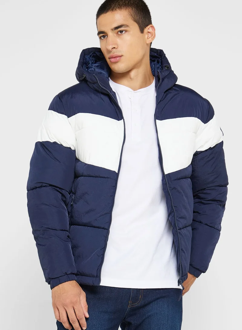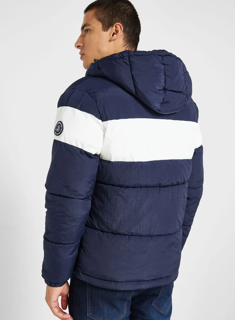 Lightweight and quilted recycled polyester fabricColorblock design all-overHoodie neck and long sleevesSecure zipper front closureDual side zipper pocketsRibbed trims to cuffs and hemJack & Jones signature brandingEach item sold separately