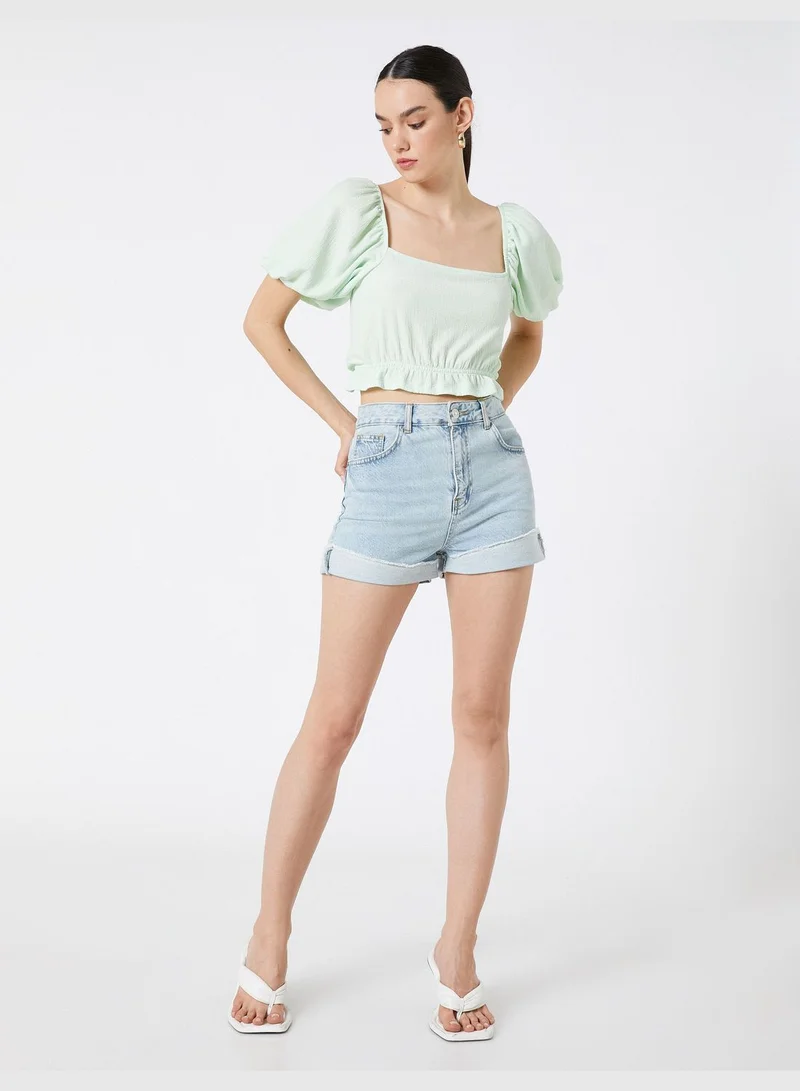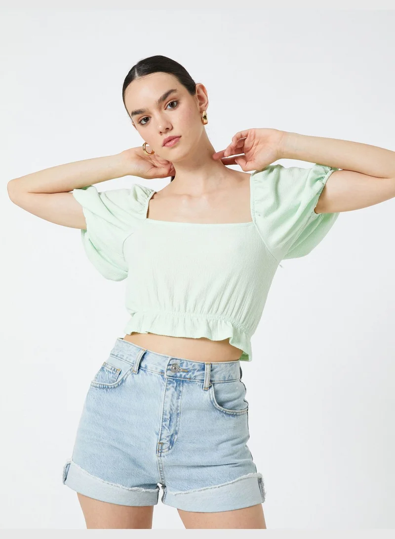 KOTON Frilled Square Neck Puff Sleeve Crop Blouse