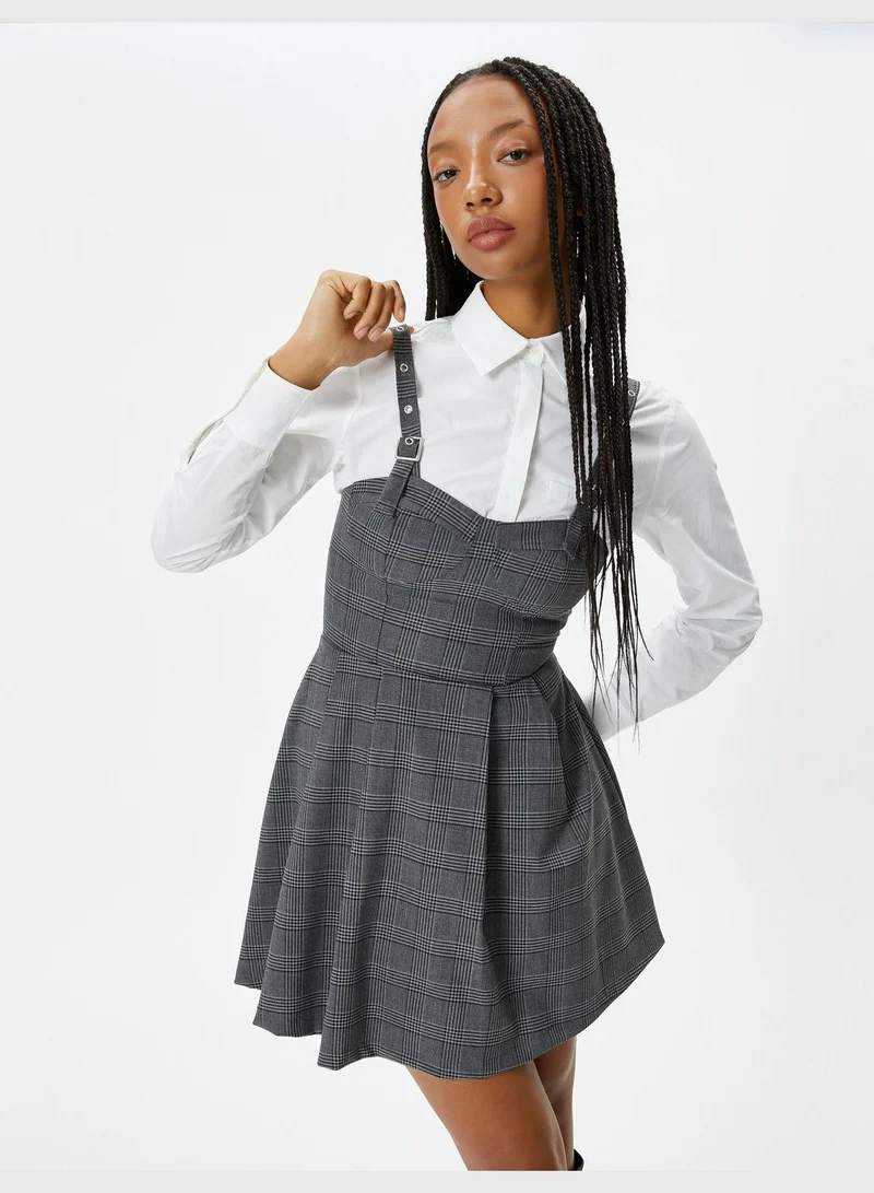 This grey plaid dress features an A-line skirt, thick shoulder straps, and a fitted waist. It's a versatile piece that can be dressed up or down.