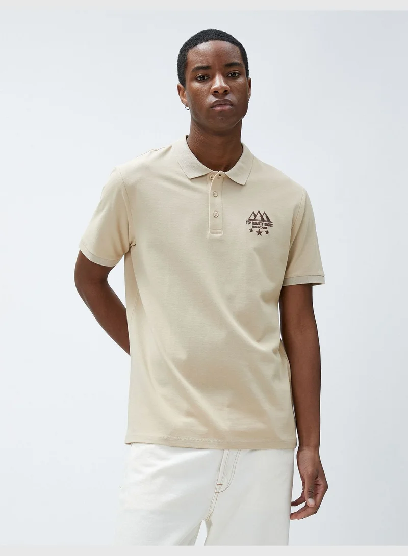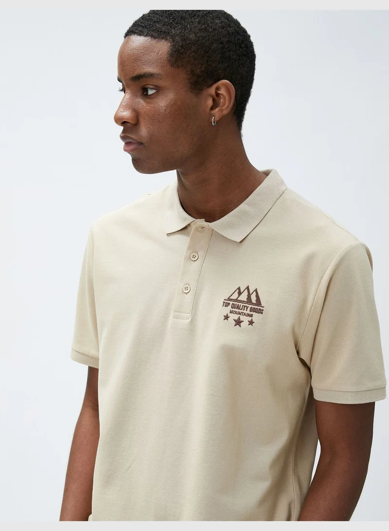 KOTON Polo Neck T-Shirt Slim Fit Buttoned Short Sleeve Landscape Embroidered