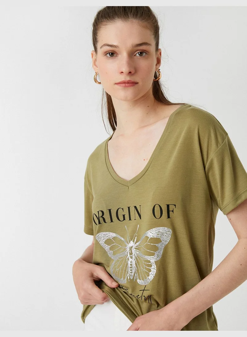 KOTON Printed T-Shirt V Neck Short Sleeve