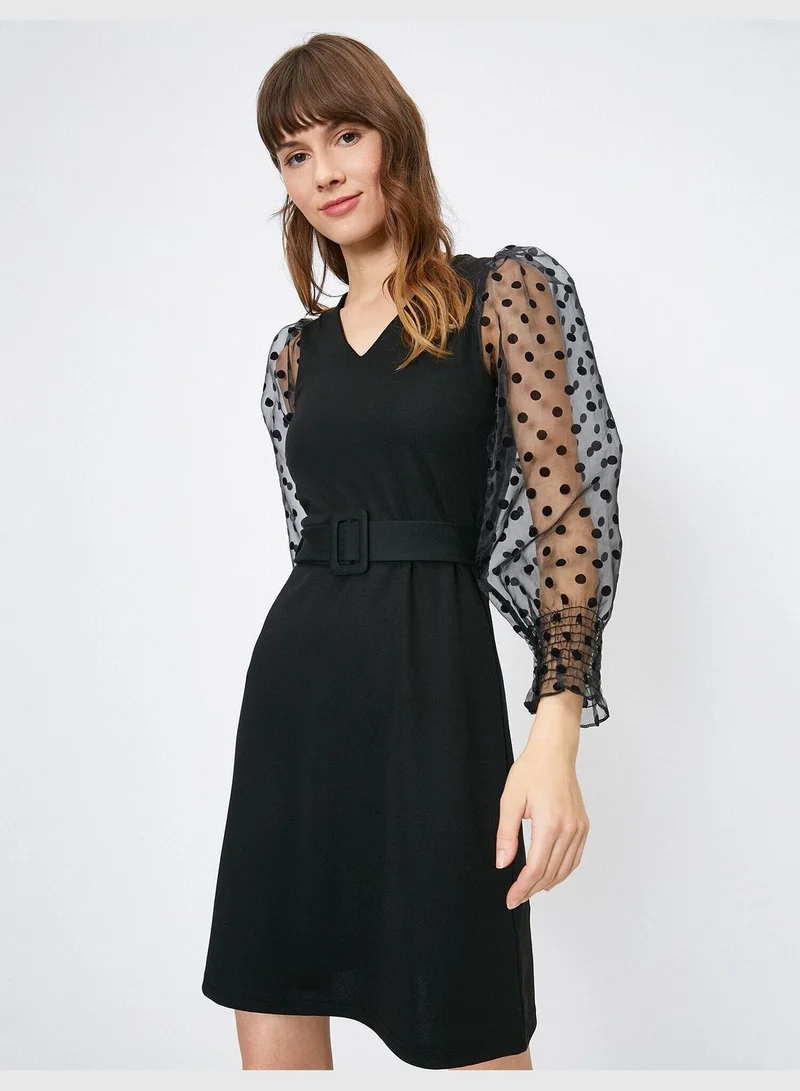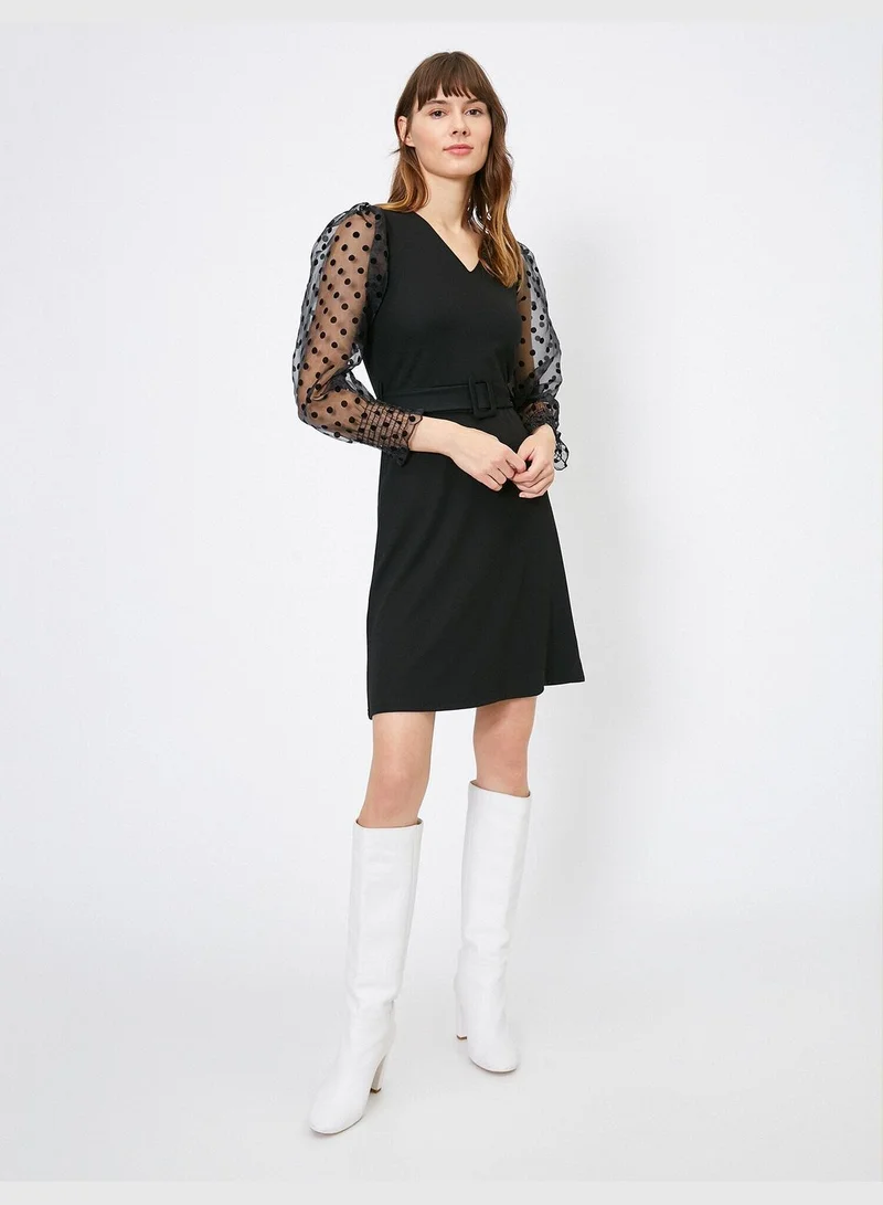 V Neck, Long Sleeve, Sleeve Detailed, Dotted, Midi Dress