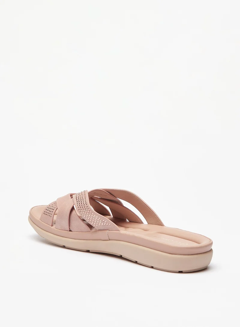 This versatile pair of sandals, charmed with interwoven embellished toe straps, is apt for regular wear. The ergonomic footbed and sturdy flat outsole ensure high comfort for your feet. This pair is well-crafted from durable PU and features a slip-on pattern.