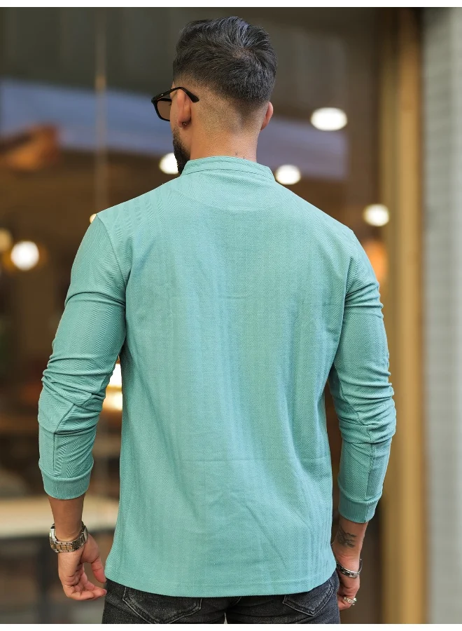 Maniac Mens Solid Textured Henly Neck Full Sleeve Berly Green Slim Fit T-Shirt