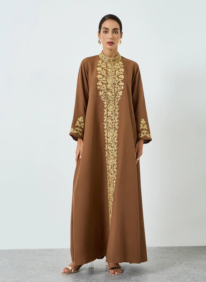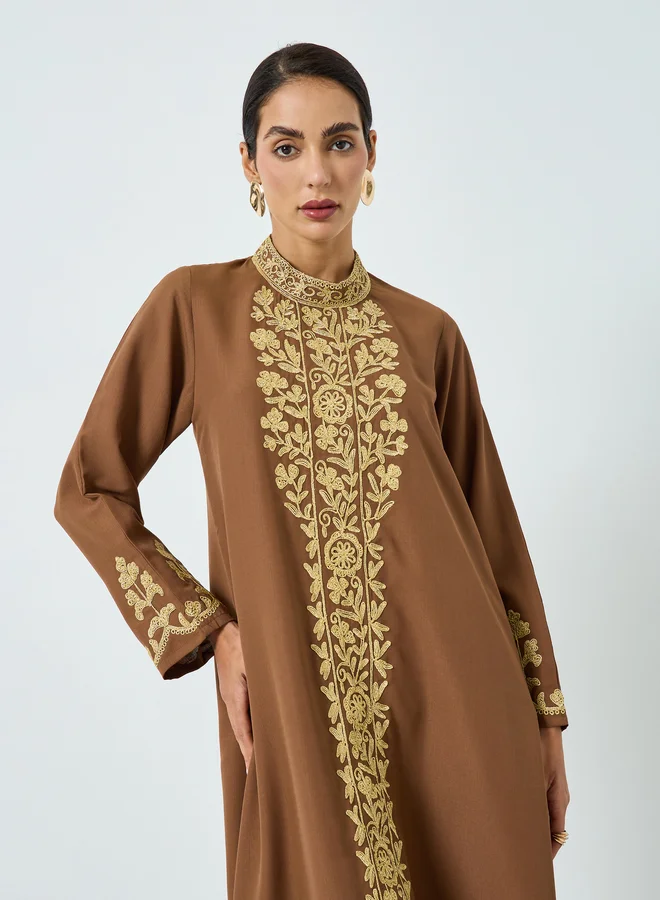Elegant brown A-line jalabiya crafted from woven polyester fabric featuring a sophisticated high neckline. Adorned with intricate gold floral embroidery along the front panel and cuffs, this maxi-length dress offers a timeless modest look. Perfect for festive occasions and formal gatherings where refined style is key.
