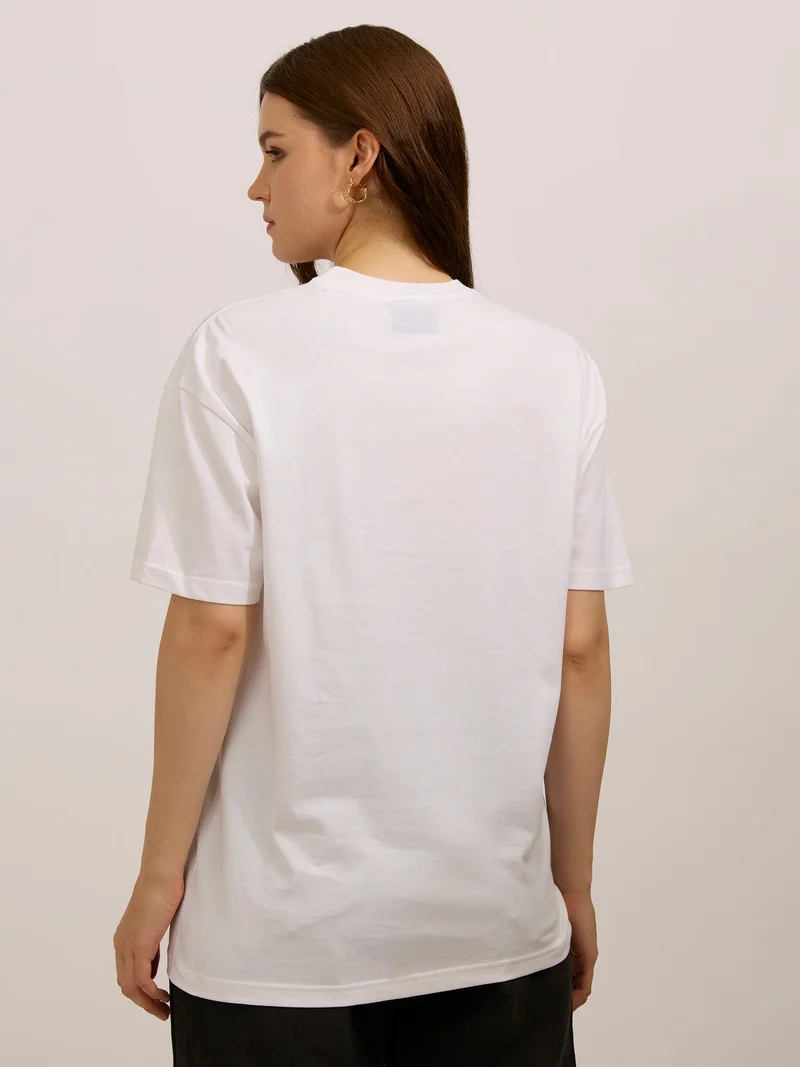 Stay effortlessly stylish in this white oversized graphic t-shirt. The urban-inspired print and baggy cotton fit are ideal for focused library study sessions or relaxed coffee dates. Its versatile design makes it a go-to for shopping trips and casual hangouts with friends.