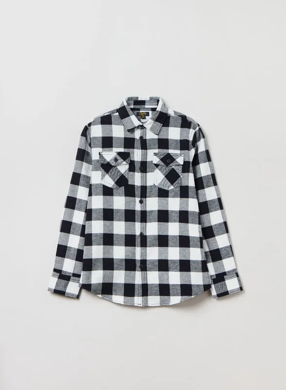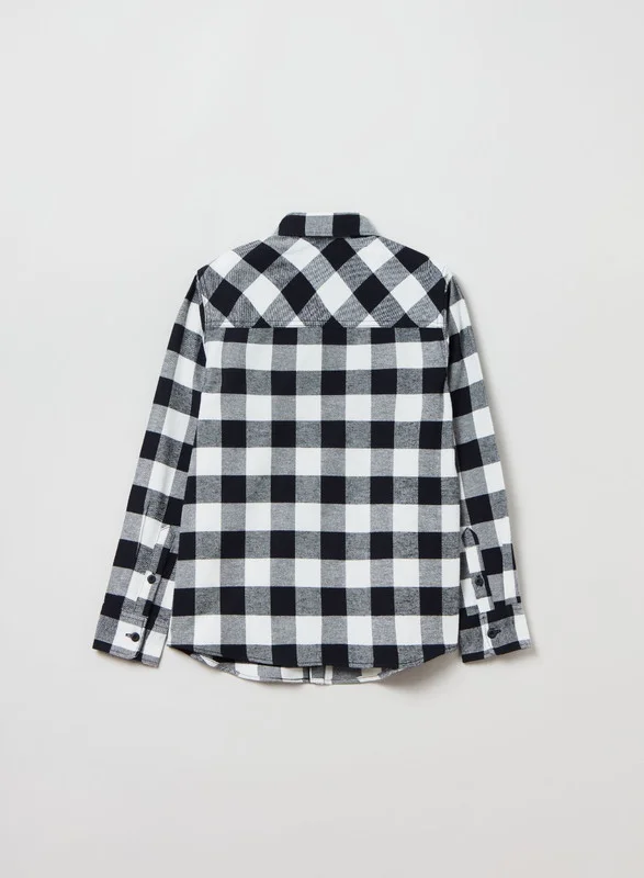 100% cotton shirt. Two-tone check pattern. Bluff collar and yoke on the back. Two pockets with flap and button on the chest. Button fastening.