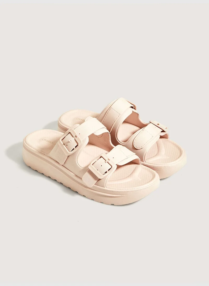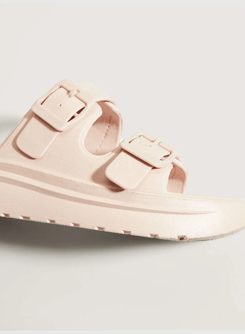Rubber sandals with two buckles on the upper. Nude colour. Sole height: 3.5cm