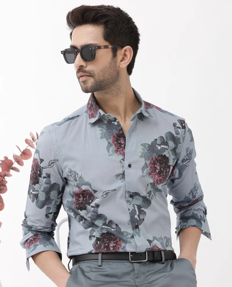 Rare Rabbit Mens Velem Grey Viscose Fabric Full Sleeve Regular Fit Floral Print Shirt