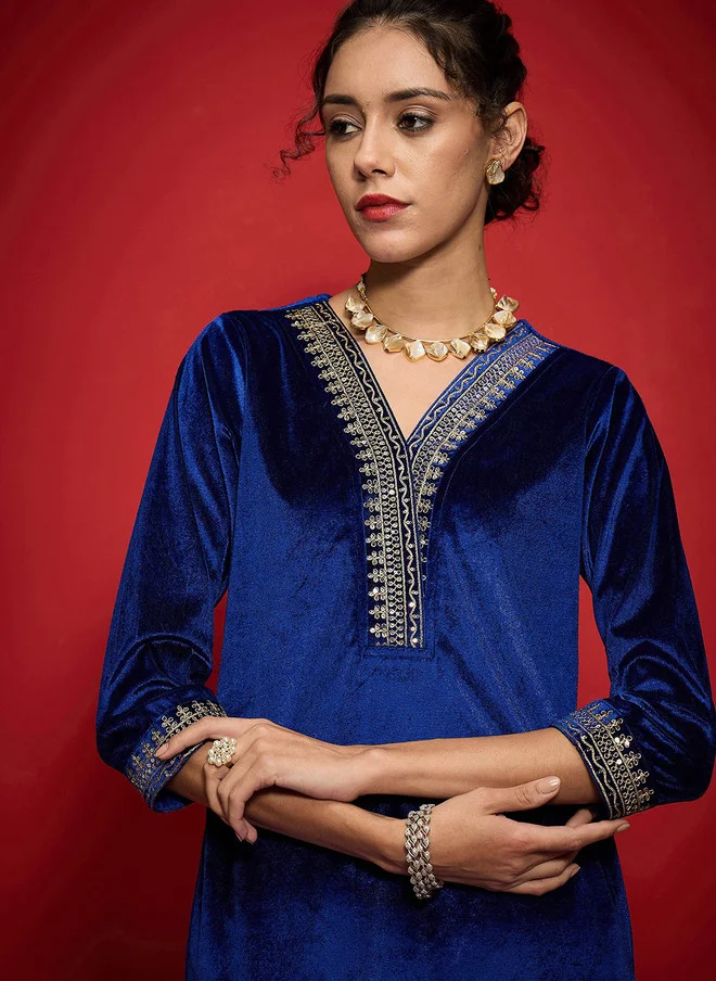 This stunning blue velvet kurta is designed for festive occasions, featuring exquisite Zari embroidery that adds a touch of grandeur. The knee-length kurta has a straight shape and a flattering V-neckline, complemented by three-quarter regular sleeves. The fabric is soft and delicate, ensuring comfort while maintaining an elegant look. With side slits for ease of movement, this kurta is perfect for celebrations. The machine-woven velvet material is not only luxurious but also durable, making it a great addition to your wardrobe. Care instructions recommend dry cleaning to preserve the intricate embellishments and fabric quality.