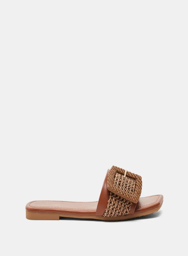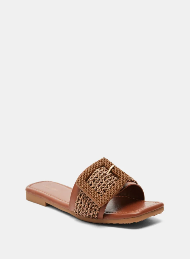 Weave Textured Buckle Accent Flat Sandals Brown