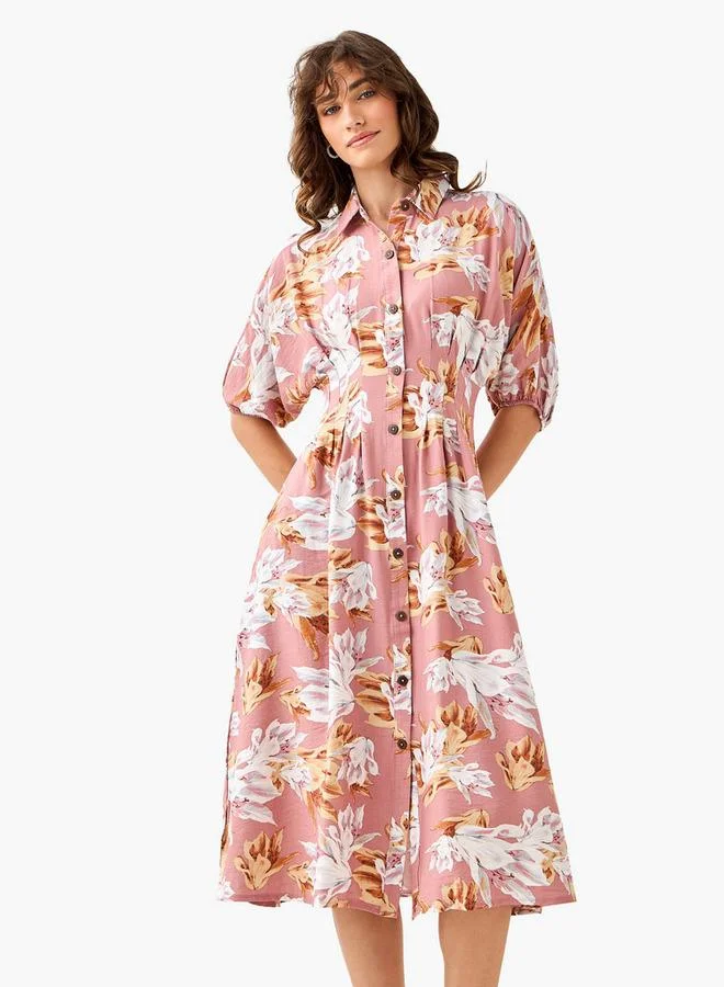 Floral Print Shirt Style Women Dress with Collar Viscose
