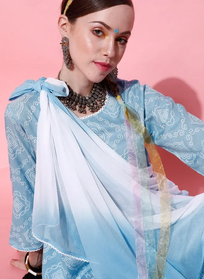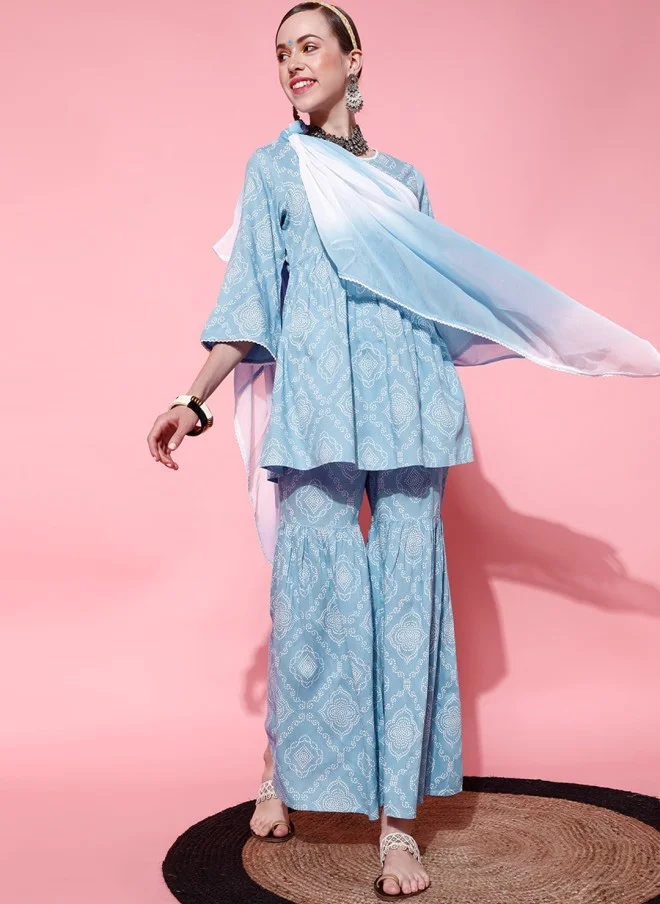 This stylish ethnic ensemble features a beautifully printed kurti made from soft viscose rayon, designed with an A-line shape and a round neck. The long sleeves add elegance, while the above-knee length and straight hemline provide a modern touch. The accompanying trousers are solid with an elasticated waistband for comfort and ease of wear. The outfit is completed with a printed poly chiffon dupatta adorned with tassels, making it perfect for daily wear or casual occasions. The fabric is machine washable, ensuring easy care and maintenance.