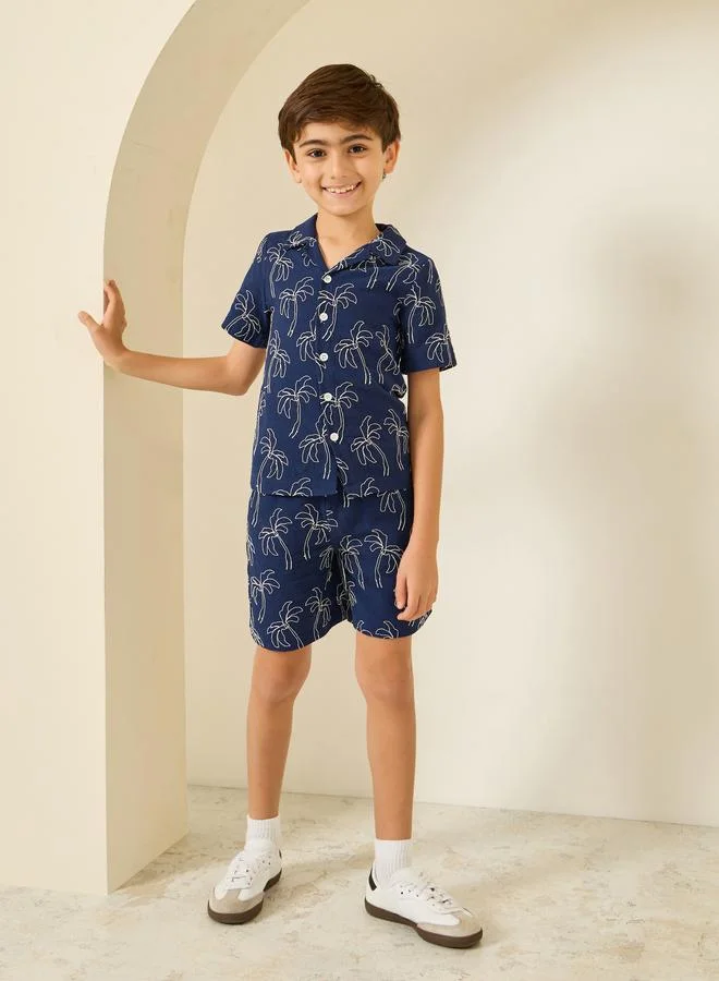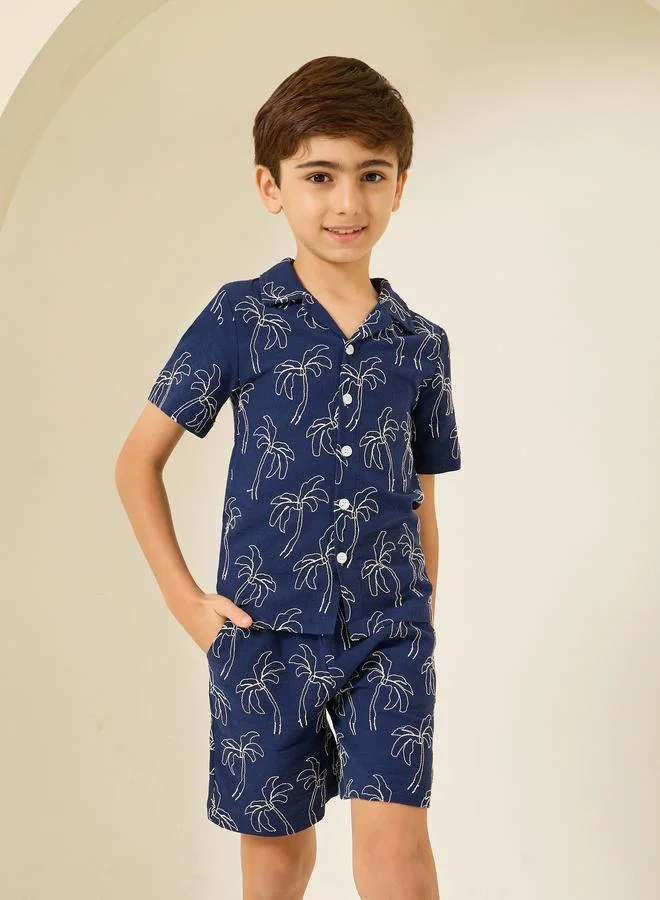 Stylish navy blue woven set featuring an all-over embroidered palm tree design. This relaxed-fit ensemble includes a Cuban collar short-sleeve shirt and matching shorts with an elasticated waistband. Crafted from durable polyester, it is the perfect outfit for summer vacations or casual outings.