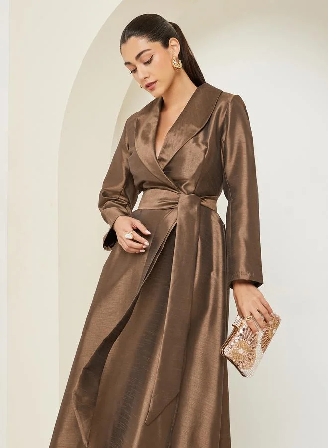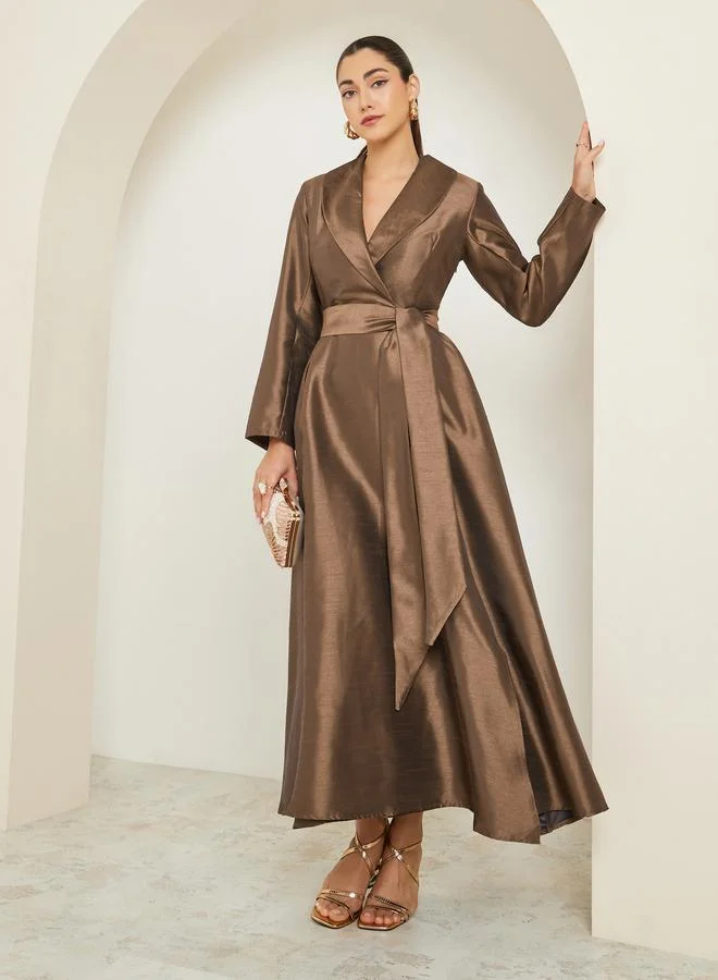 Elegant brown blazer maxi dress crafted from shimmering woven organza. Features a sophisticated lapel collar, long sleeves, and a flattering waist tie closure. Perfect for evening events or parties when styled with metallic heels.