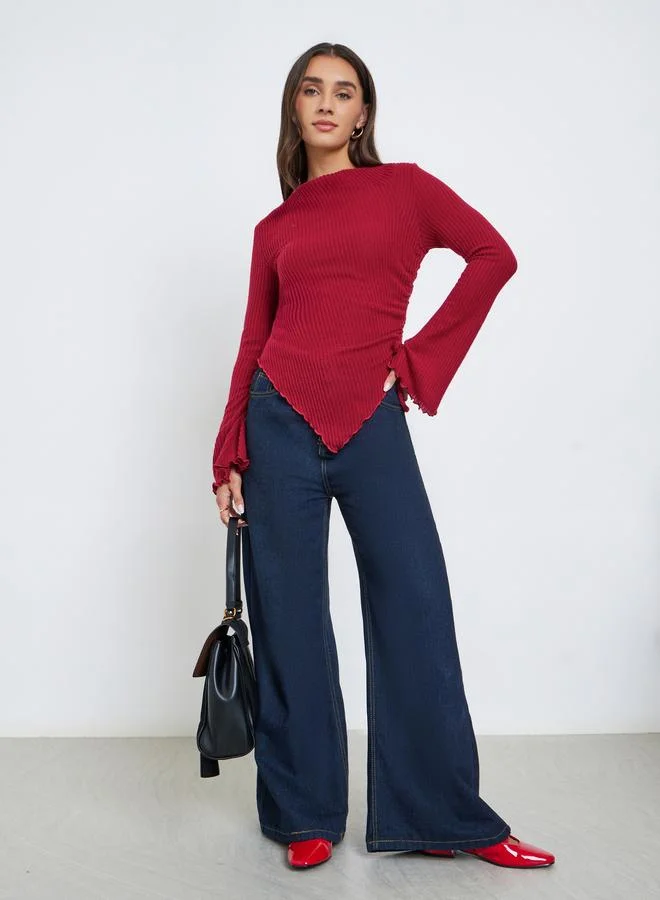 Styli Burgundy Ribbed Asymmetric Hem Long Sleeve Top
