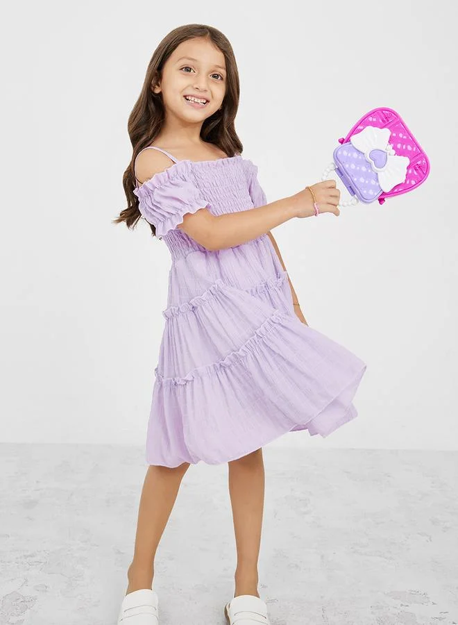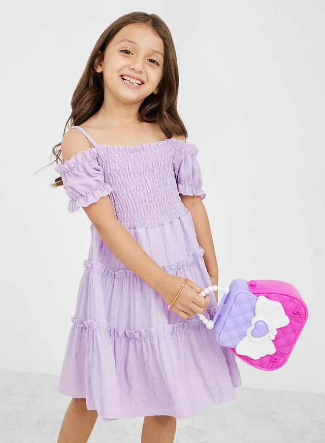 Styli Cold Shoulder Sleeve Shirred Tiered Dress