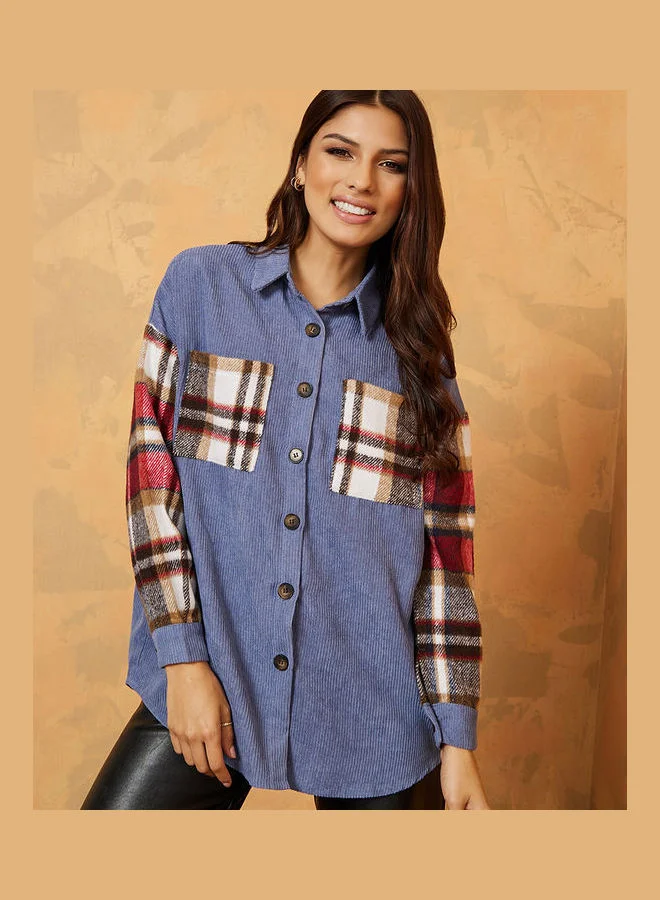 Styli Contrast Checked Pattern Oversized Longline Corduroy Shirt
