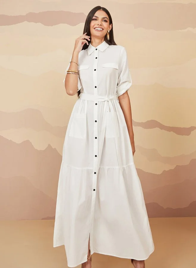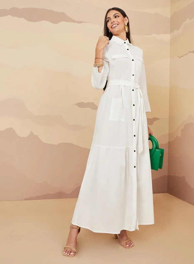 Styli Flap Pocket Detail Shirt Maxi Dress