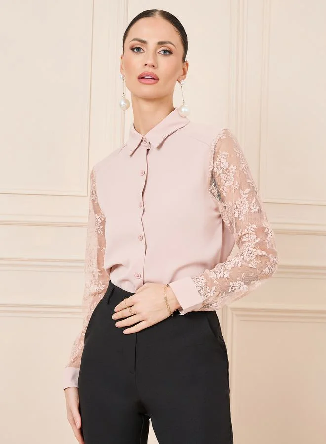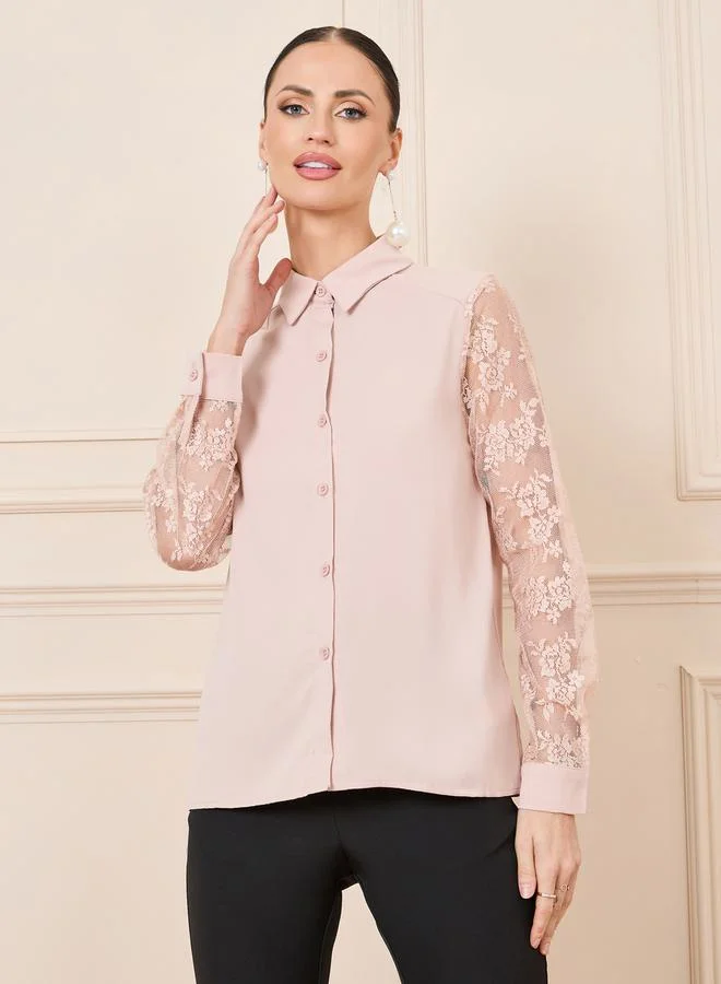 Styli Floral Mesh Sleeve Button Down Shirt