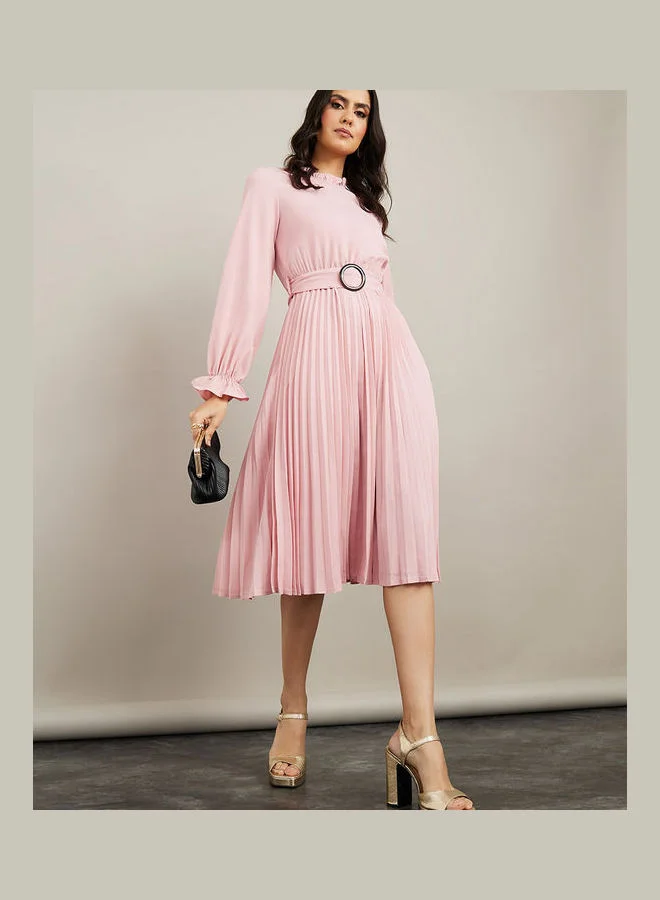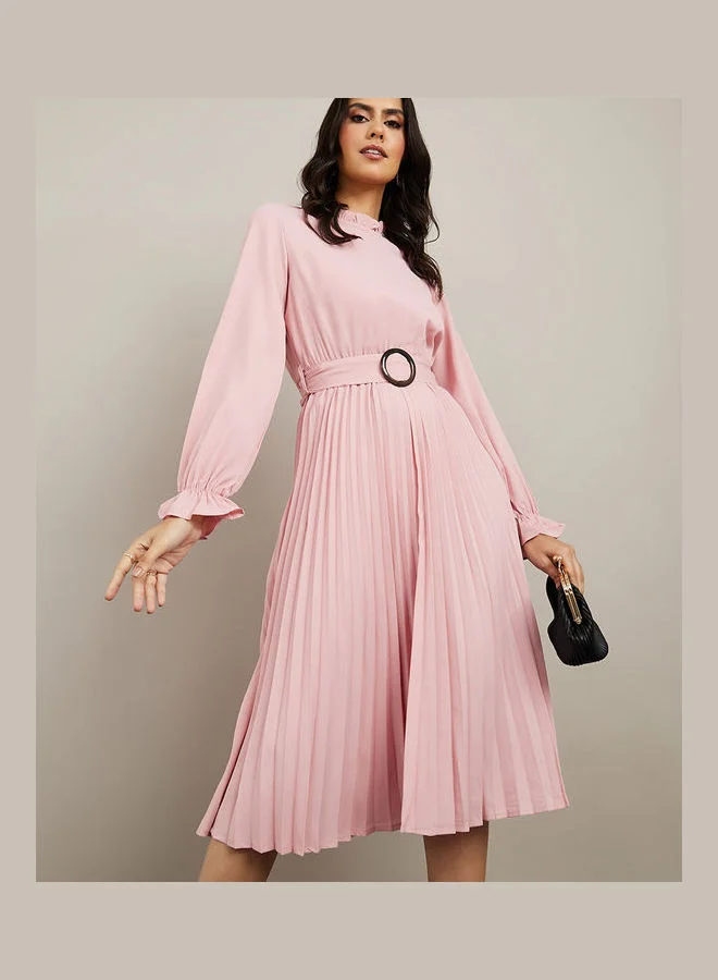 Styli High Neck Pleated A-Line Midi Dress