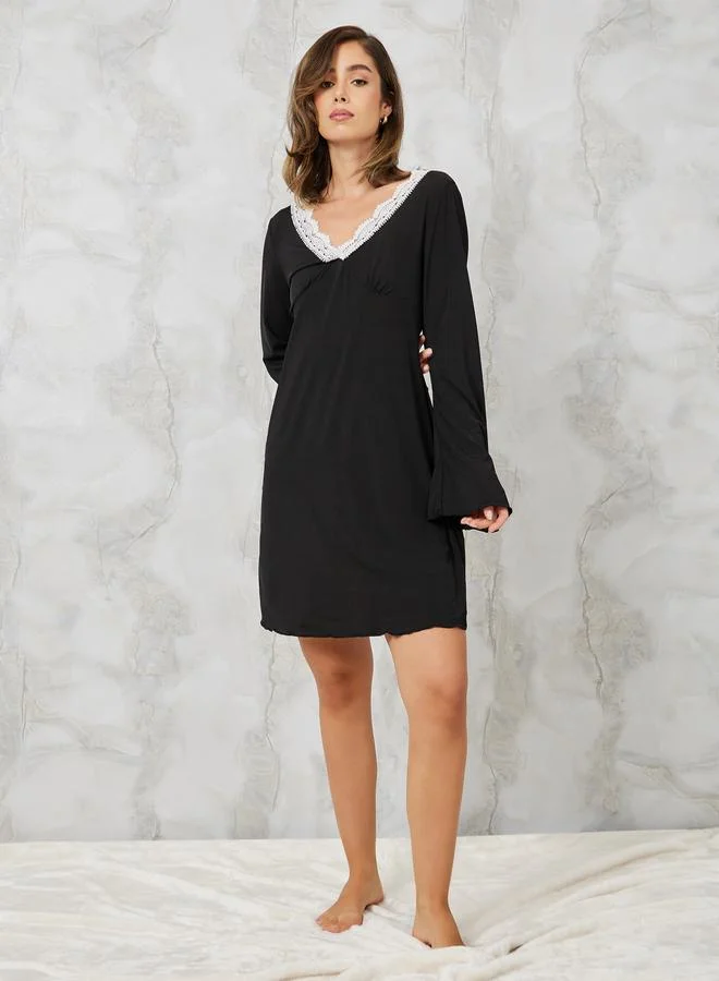 Styli Lace Detail Lettuce Hem Long Sleeve Sleep T-Shirt Dress