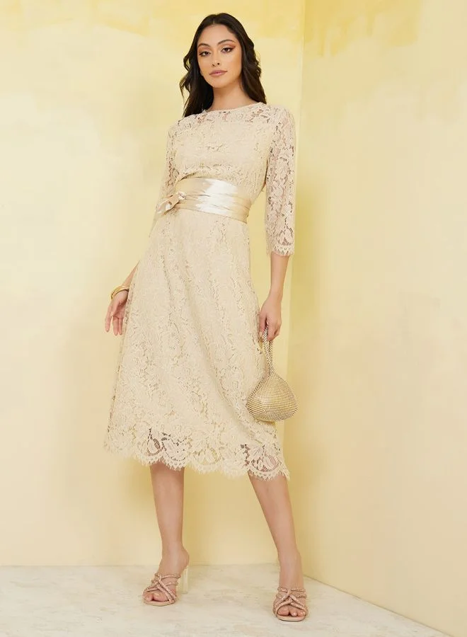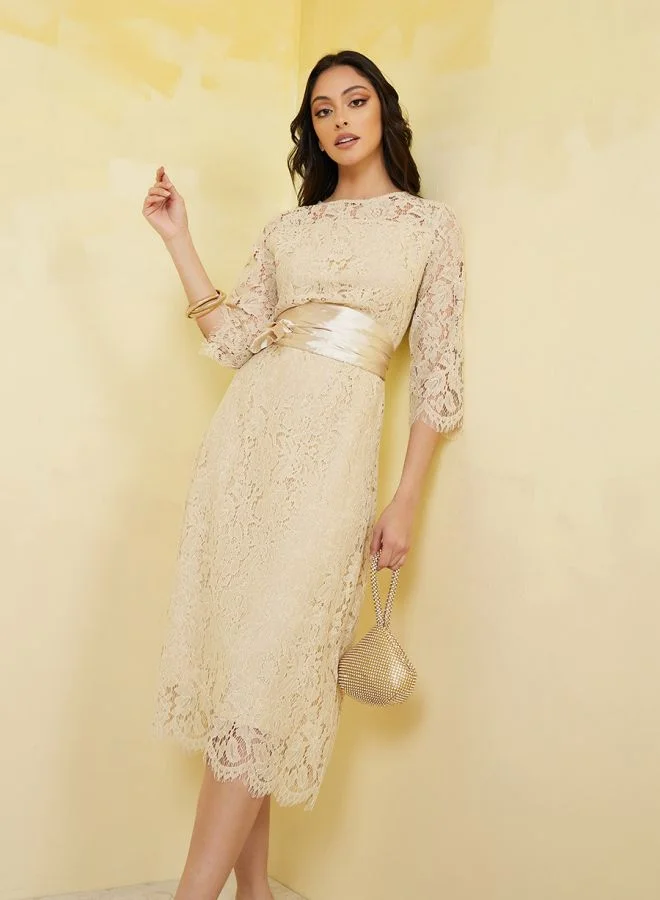 Styli Lace Insert Sheath Midi Dress with Wrap Belt