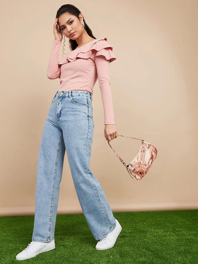 Styli Long Sleeves Asymmetric Neck Ribbed Blouse