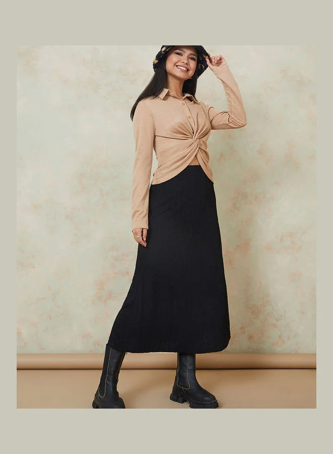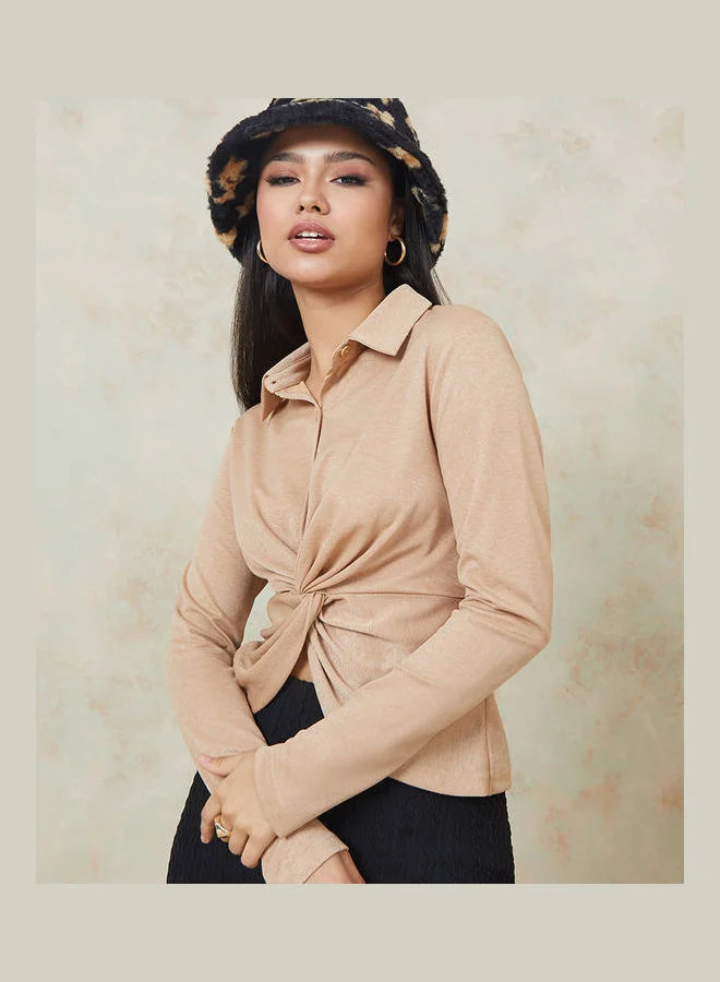 Styli Long Sleeves Front Twist Detail Knit Collared Top