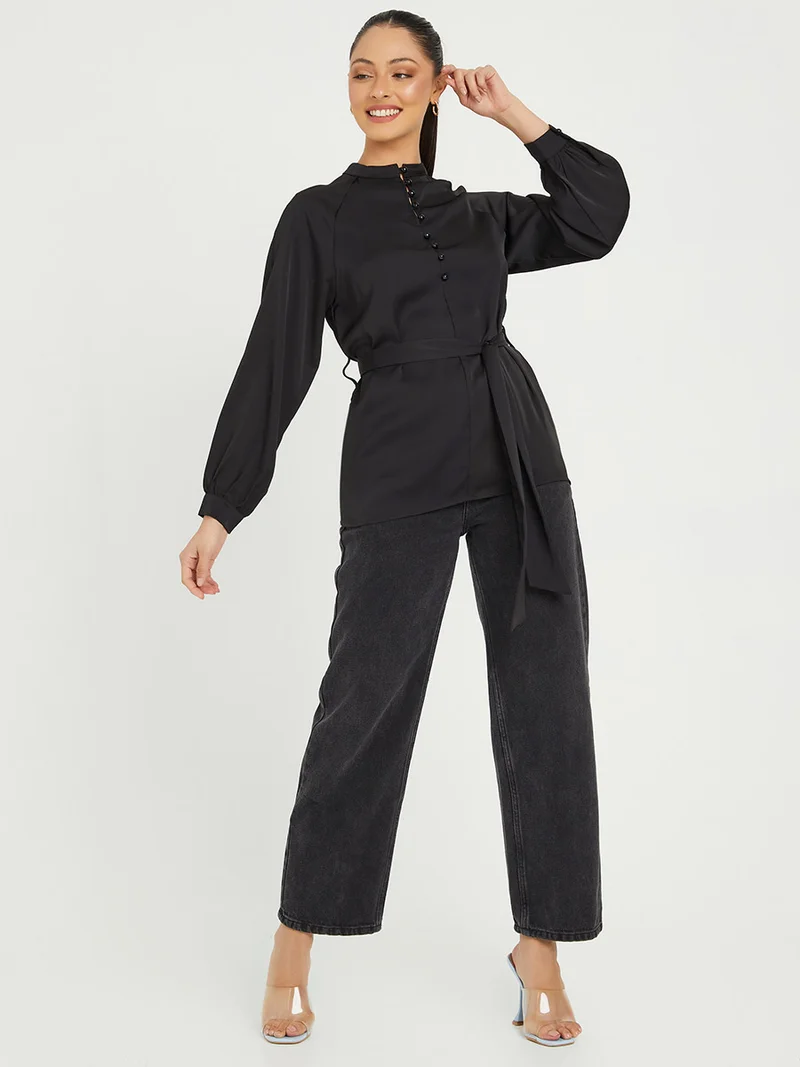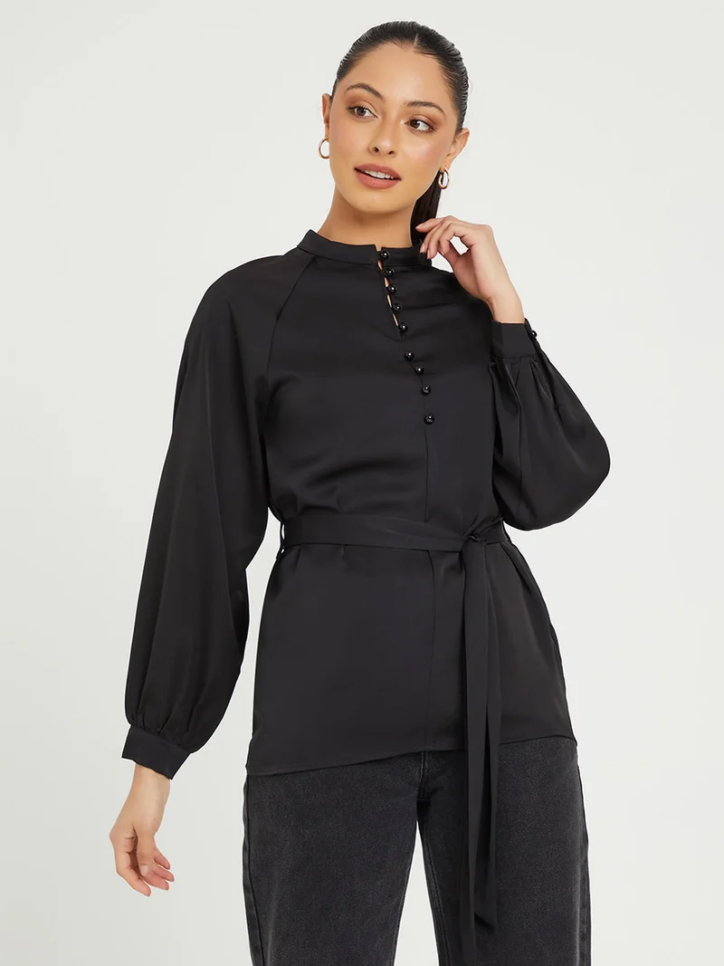 Styli Long Sleeves High Neck Button Front Blouse with Self Tie Up