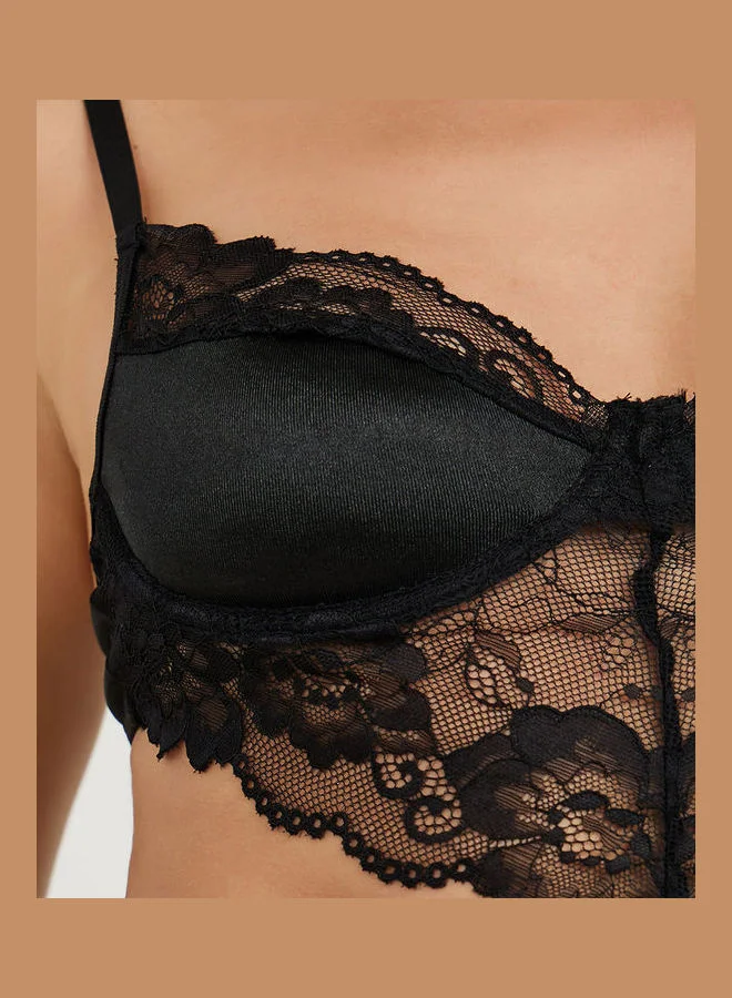 Longline V Shape Lace Balconette Bra with Solid Cups & Double Elastic Thong