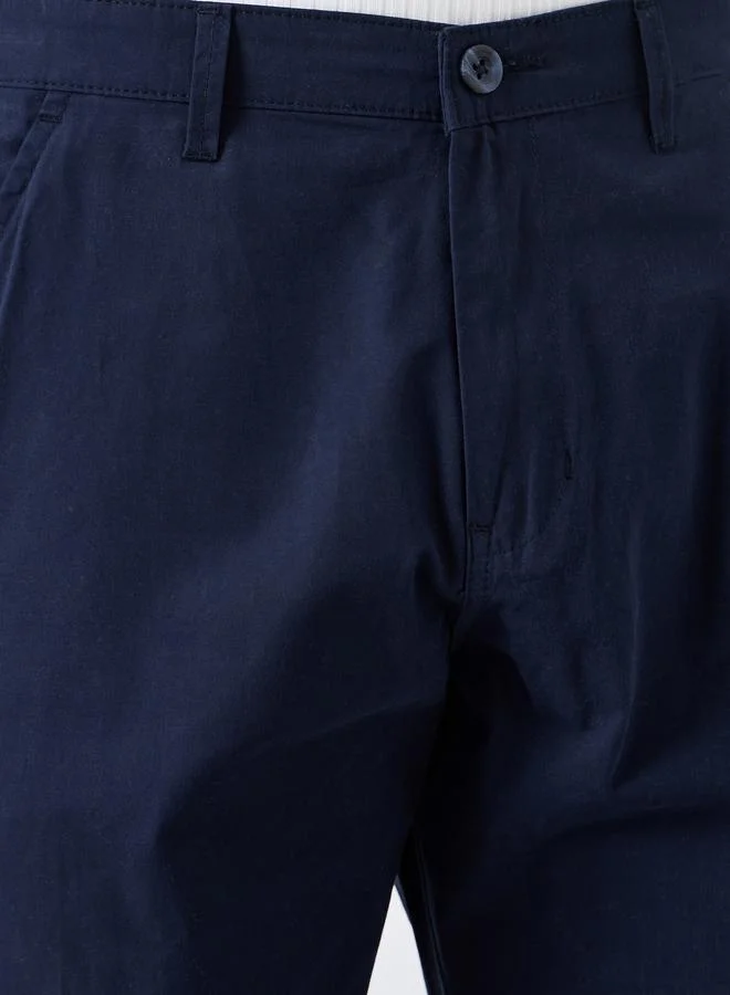 Classic navy blue cotton chinos tailored in a regular tapered fit. Designed with a flat front, mid-rise waist, and functional slant pockets. These solid woven trousers offer a versatile, minimalist look suitable for smart-casual daytime wear.