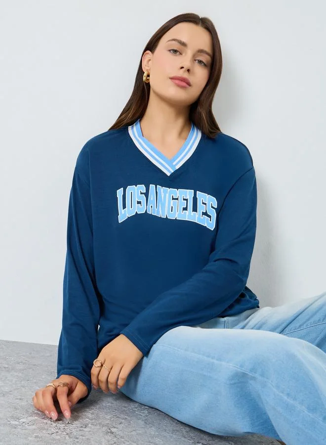 Stay trendy with this navy blue oversized T-shirt featuring a graphic print, V-neck, long sleeves and a color-blocked collar.
