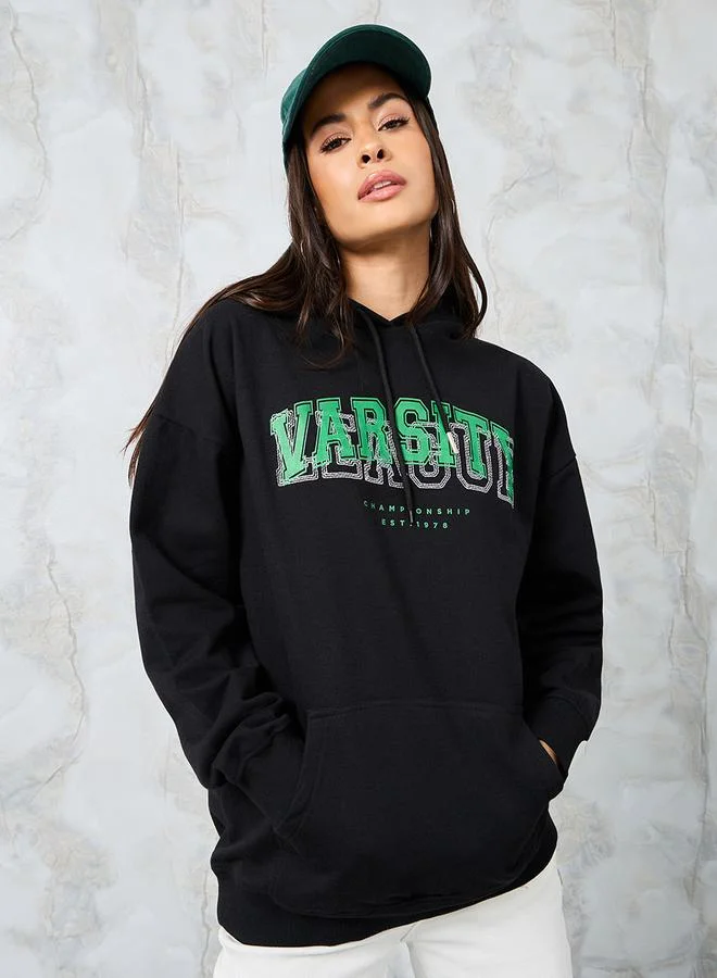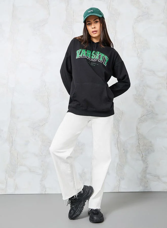 Styli Oversized Longline Slogan Embroidered Hoodie