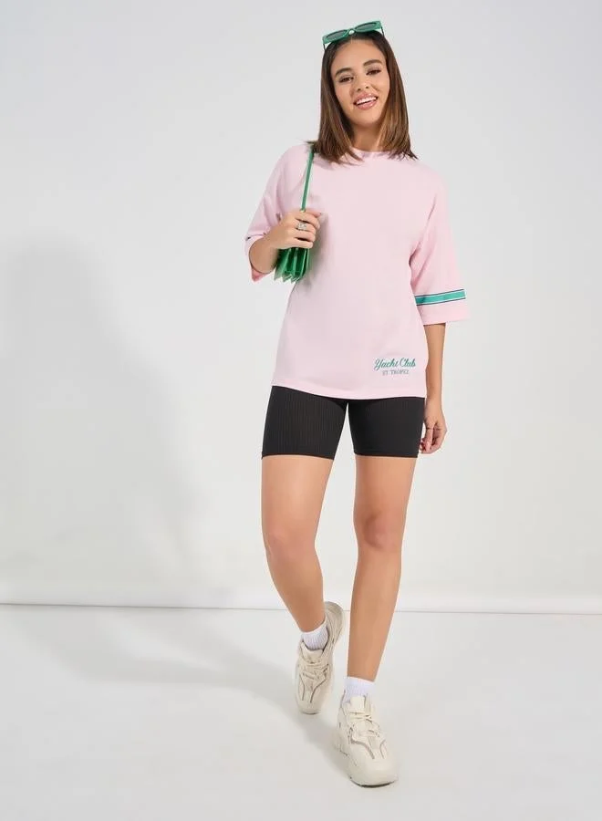 Light pink oversized t-shirt crafted from soft cotton blend jersey for breathable comfort. Featuring dropped shoulders, 3/4 sleeves, and a bold 'Yacht Club' varsity graphic on the back. A stylish casual staple perfect for pairing with biker shorts or denim.