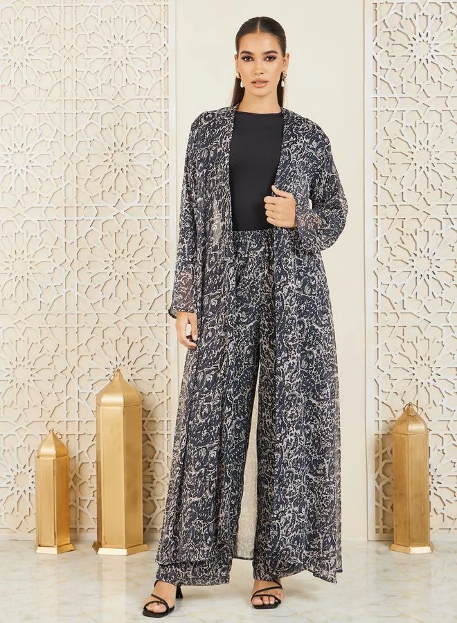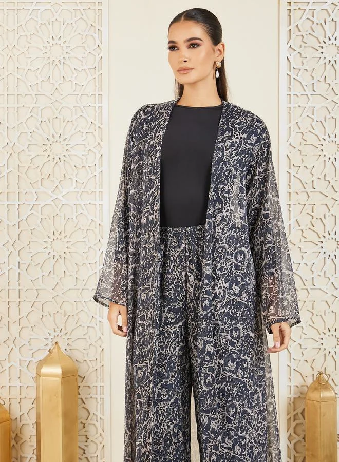 Styli Paisley AOP Abaya, Inner Top and Wide Leg Pant Set