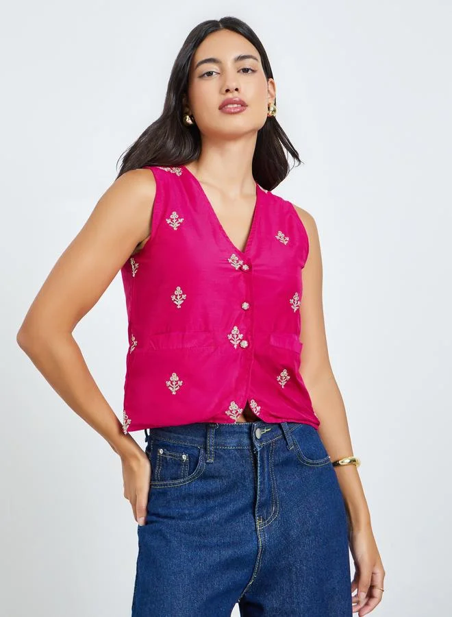 Chic pink waistcoat crafted from smooth woven polyester for a polished look. Featuring a V-neckline and sleeveless design, it is detailed with delicate floral embroidery and a button-down front. Perfect for layering over shirts or wearing solo for a trendy daytime ensemble.