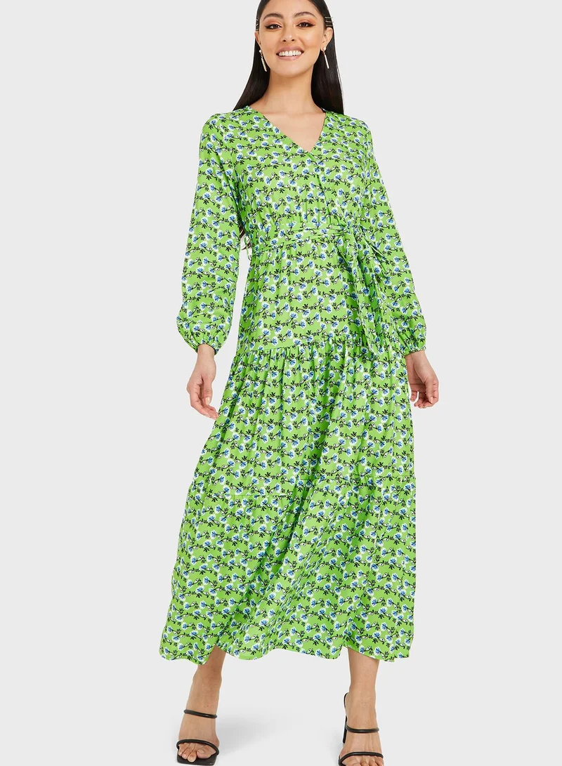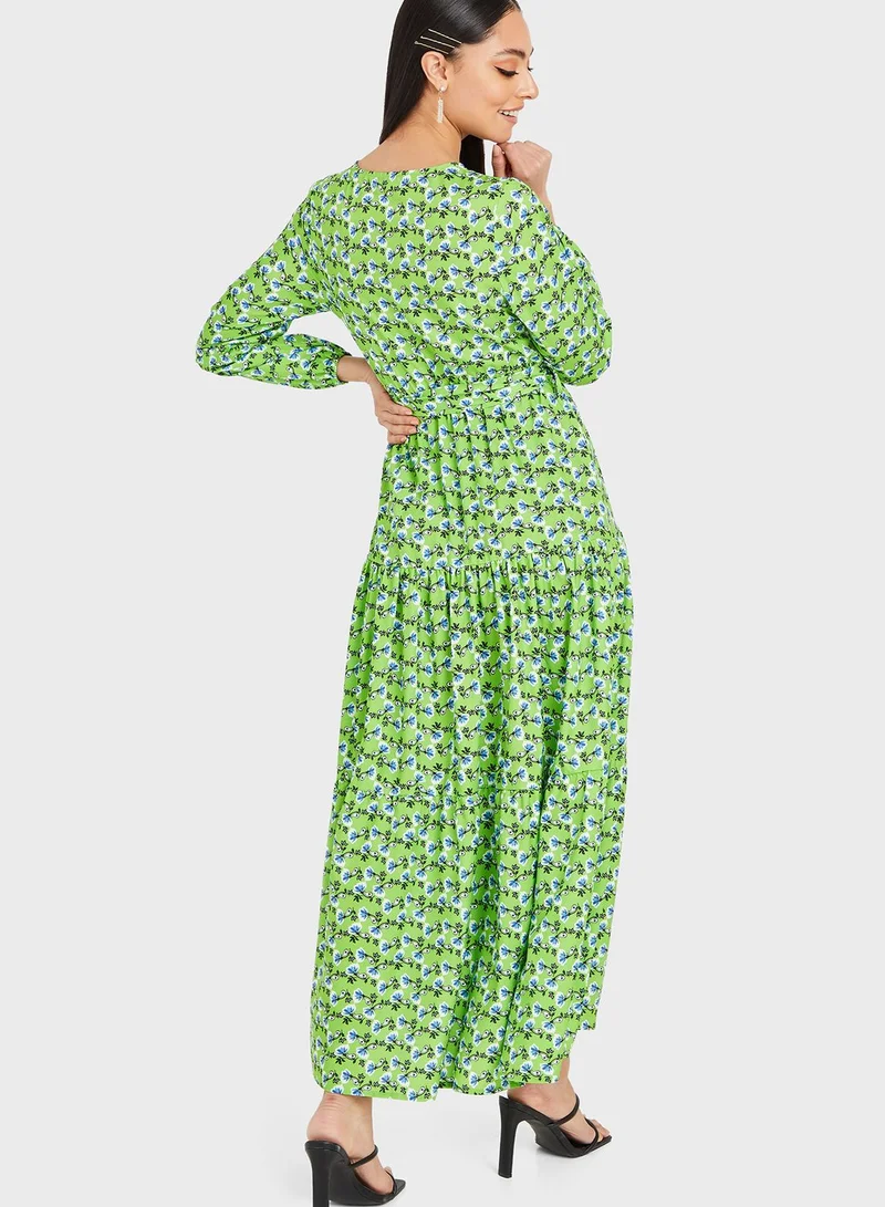 Long Sleeves Ditsy Floral Print Tiered Maxi Dress