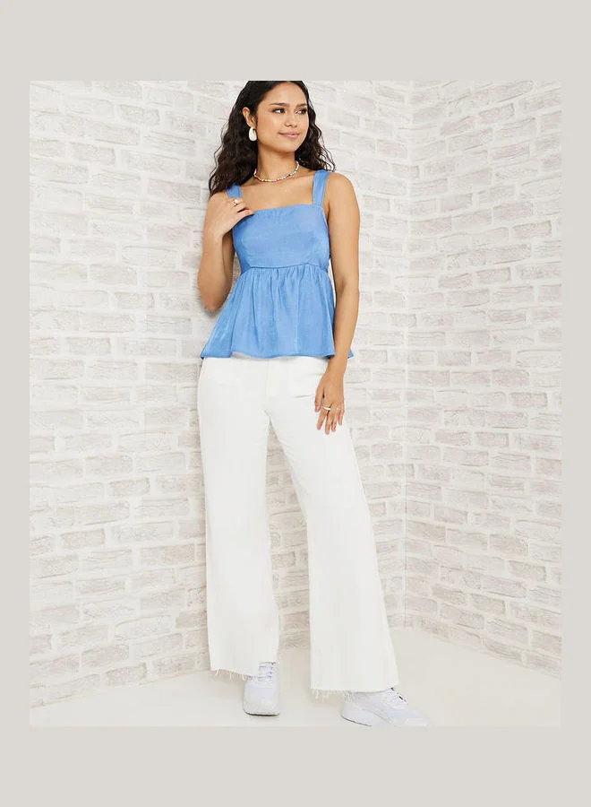Styli Sleeveless Denim Peplum Top with Tie Back Detail
