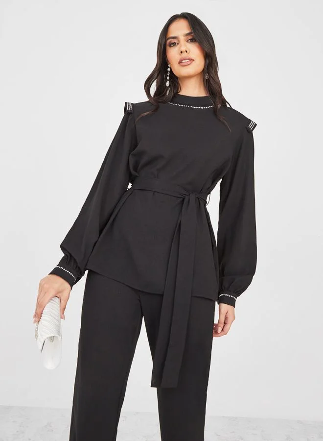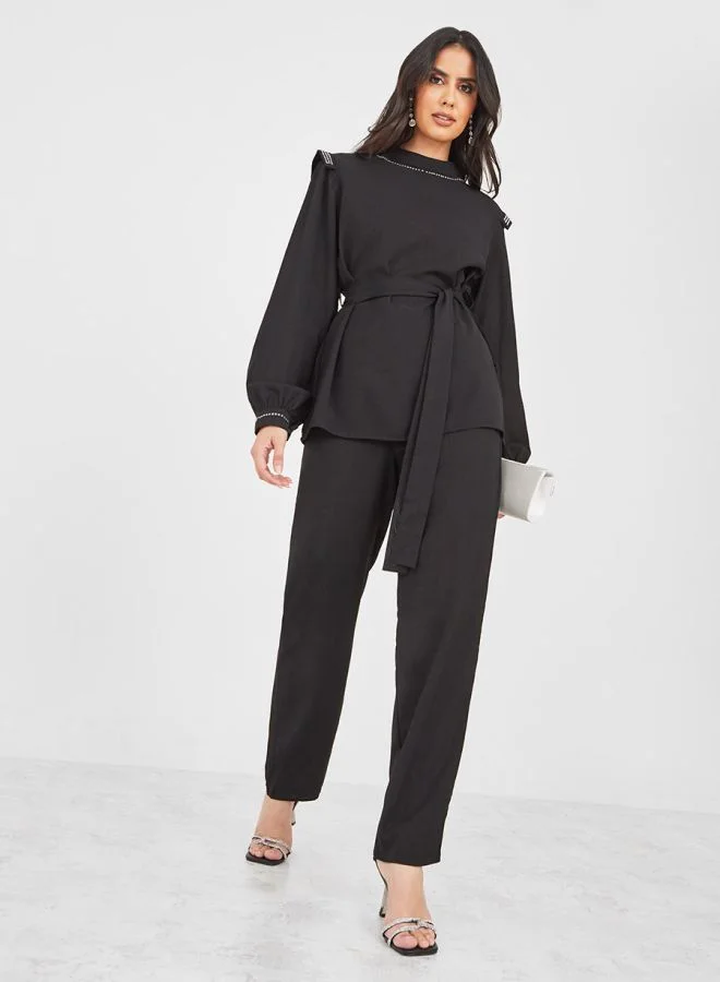Styli Stud Detail High Neck Longline Top and Trouser Set with Self Tie Belt